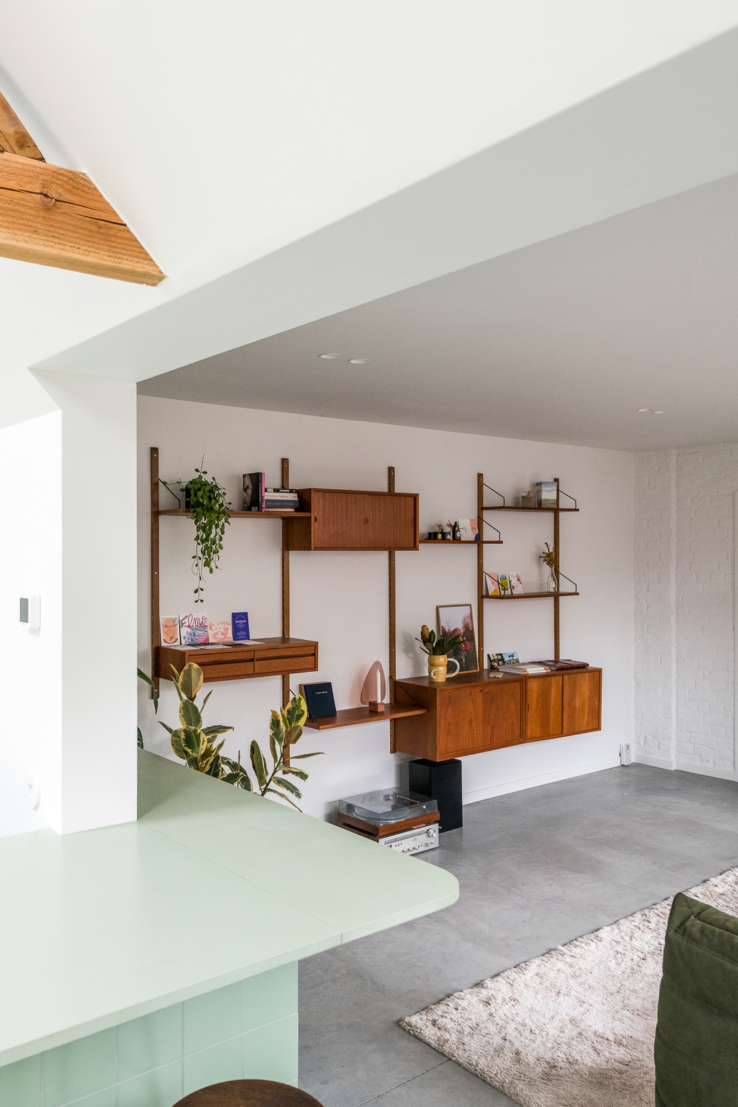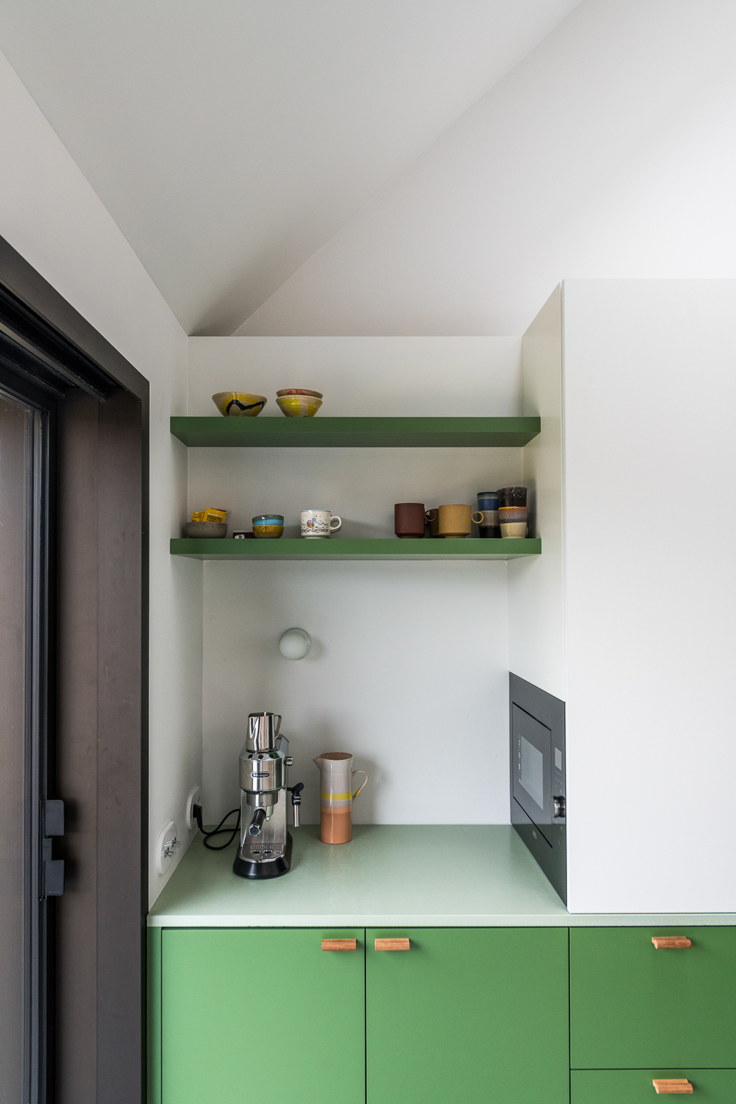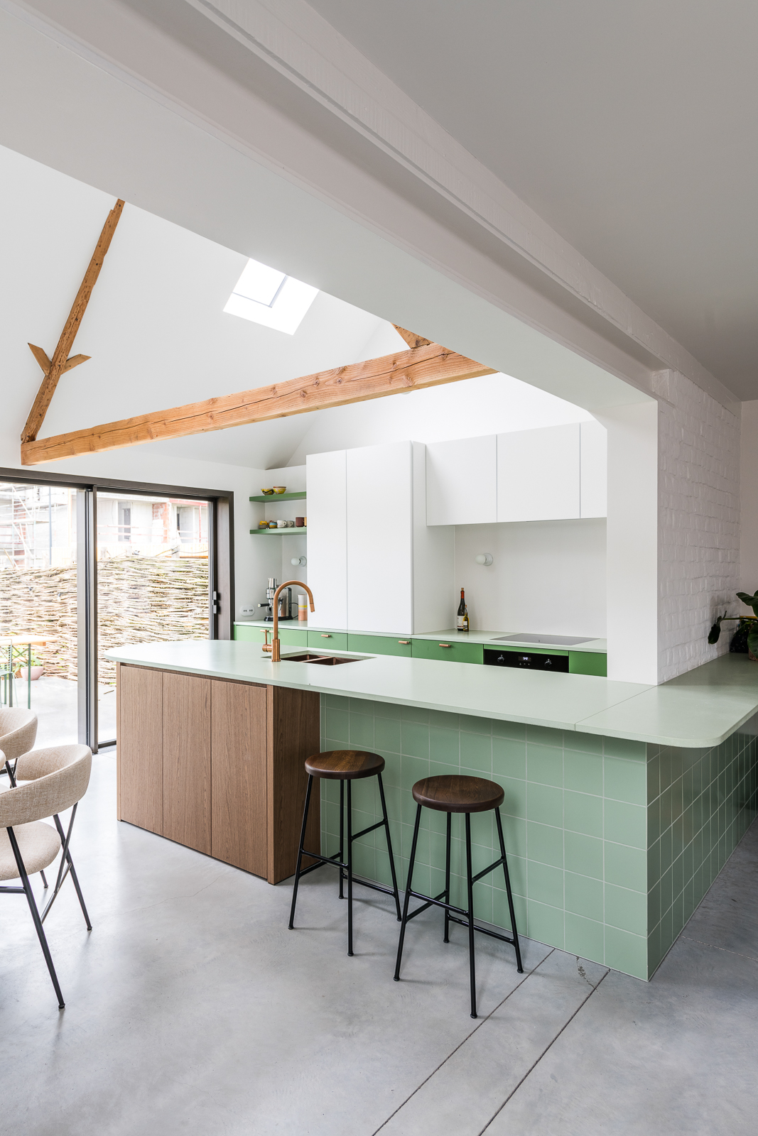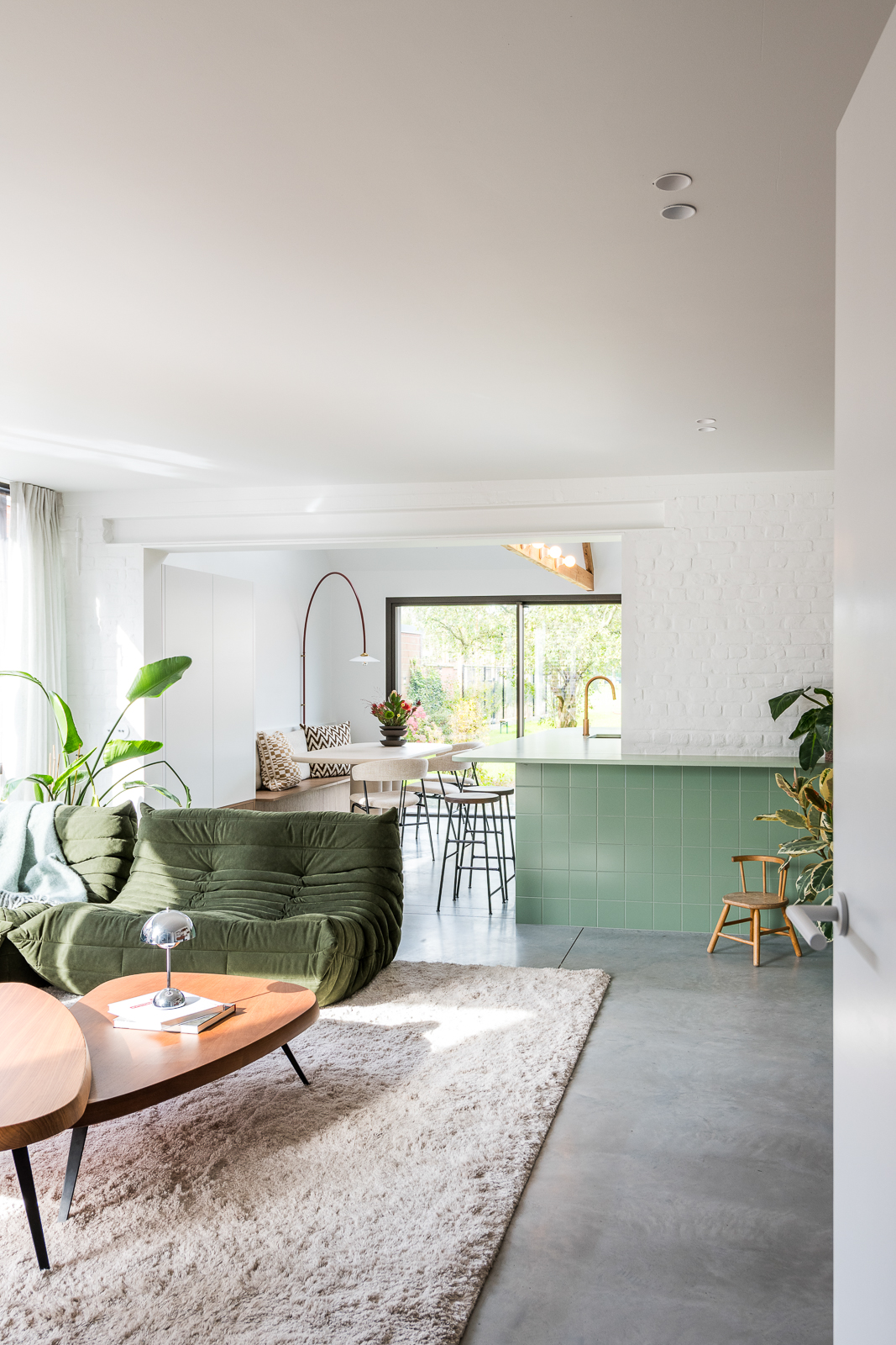 A townhouse in Drongen offers a green retreat for a couple with two young children. Warm, natural materials are highlighted with green elements. The open space connects living room and kitchen without losing the intimacy. The old chalet vibe turned into a vibrant atmosphere where the kitchen gives character and invites you to sit around. We’ve created a unique colour pallet of different greens adding wooden elements for an inviting touch and beauty.